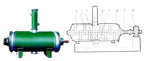 1、殼體 2、耙齒 3、出料裝置 4、加料裝置 5、粉碎棒 6、密封裝置 7、攪拌軸 8 、傳動裝置